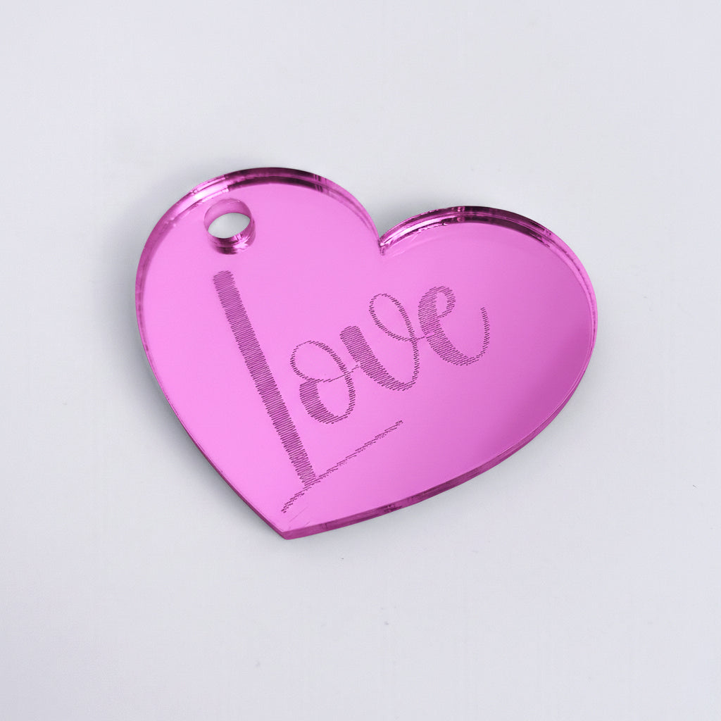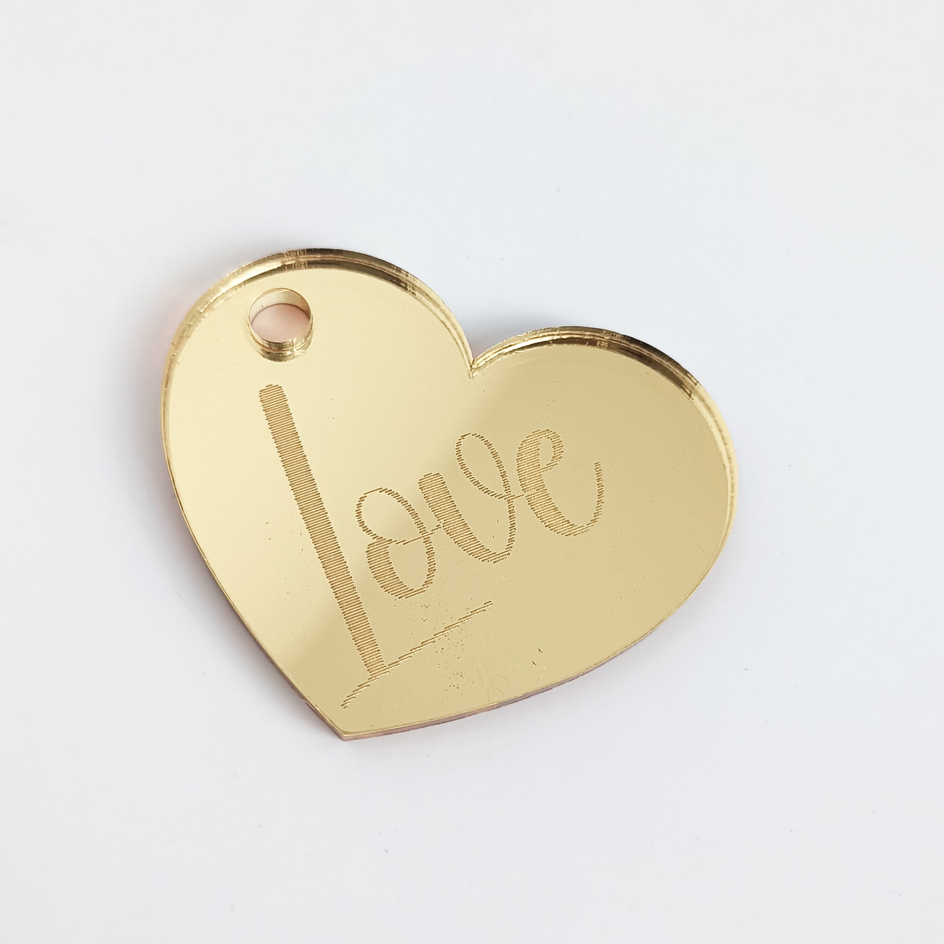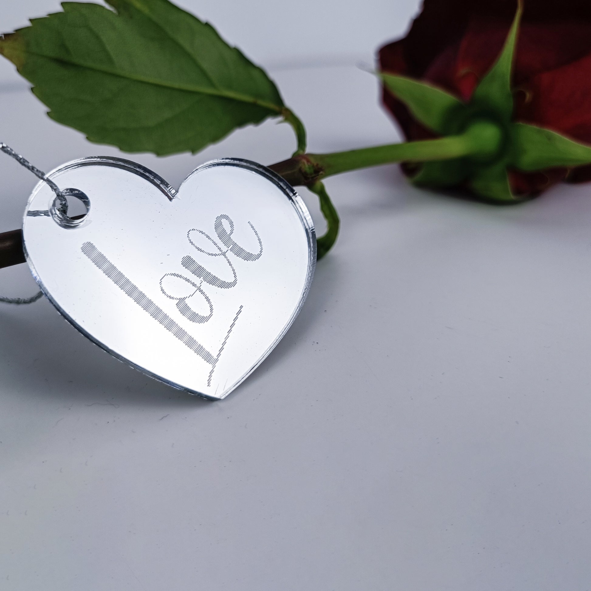 Design: Etichetă în formă de inimă cu orificiu de prindere și mesaj „Love” gravat laser.