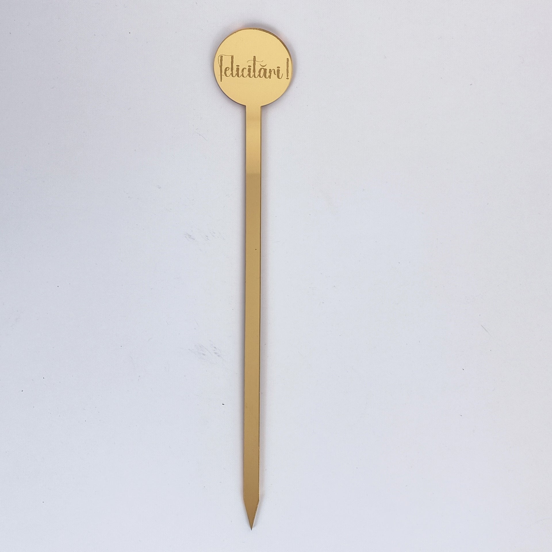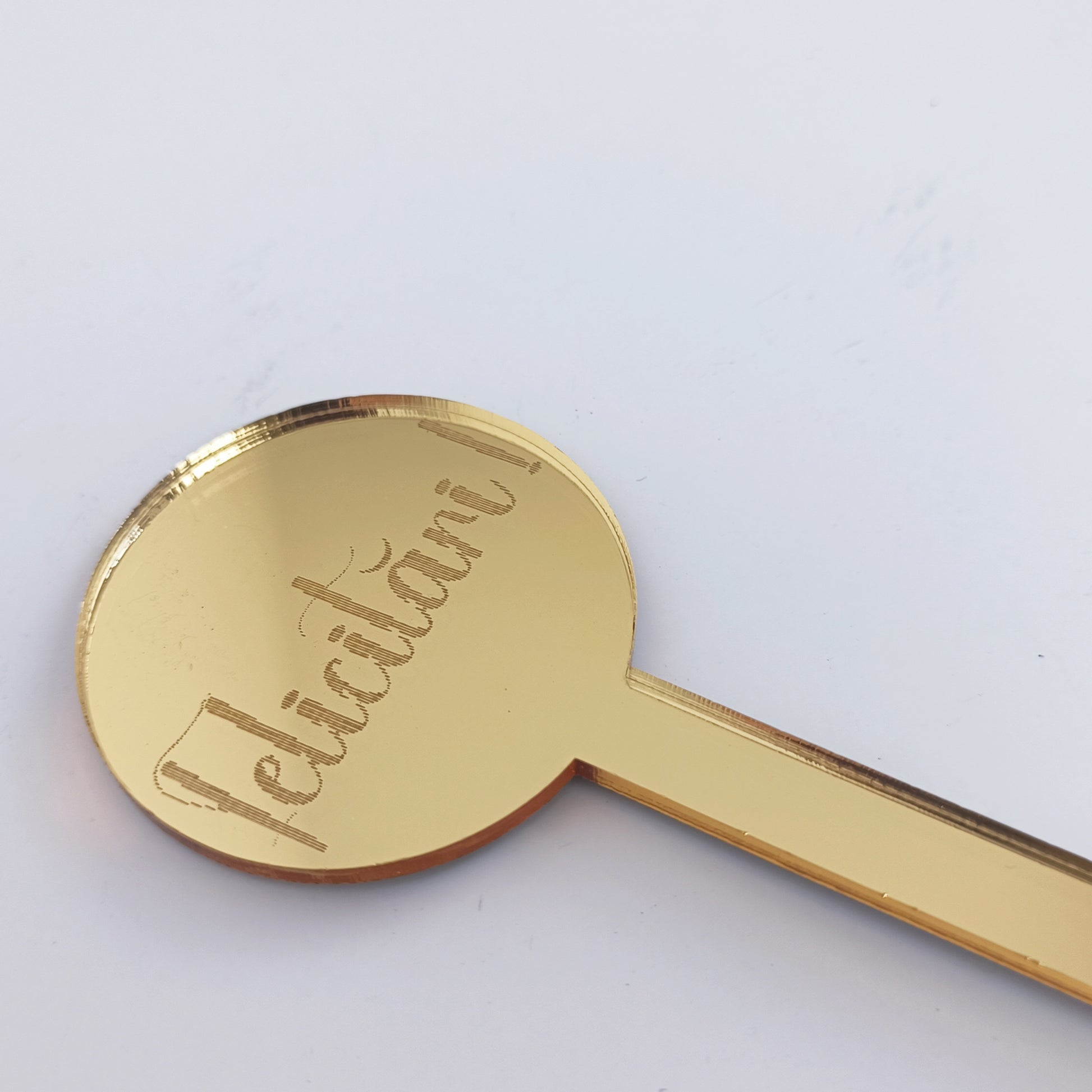 Design: Formă circulară cu mesajul „Felicitări !” gravat laser cu înaltă precizie.