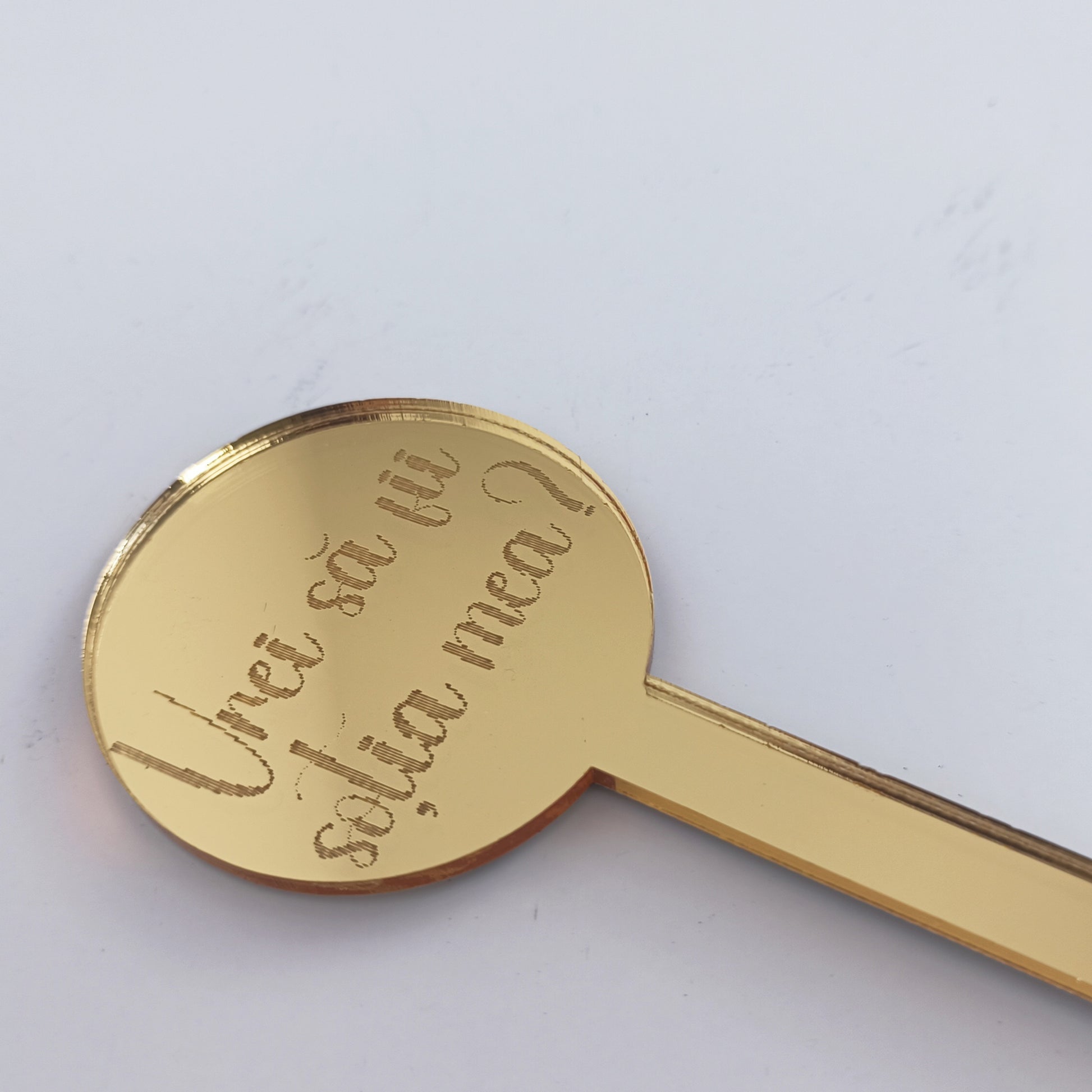 Design: Formă circulară cu mesajul „Vrei să fii soția mea?” gravat laser cu mare precizie.